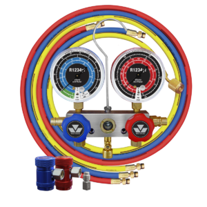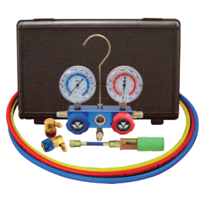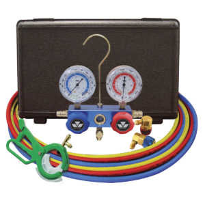 Features and Benefits: Aluminum block with sight glass Anti-flutter, recalibrateable gauges Standard couplers SAE certified 134A 60″ hoses Includes free