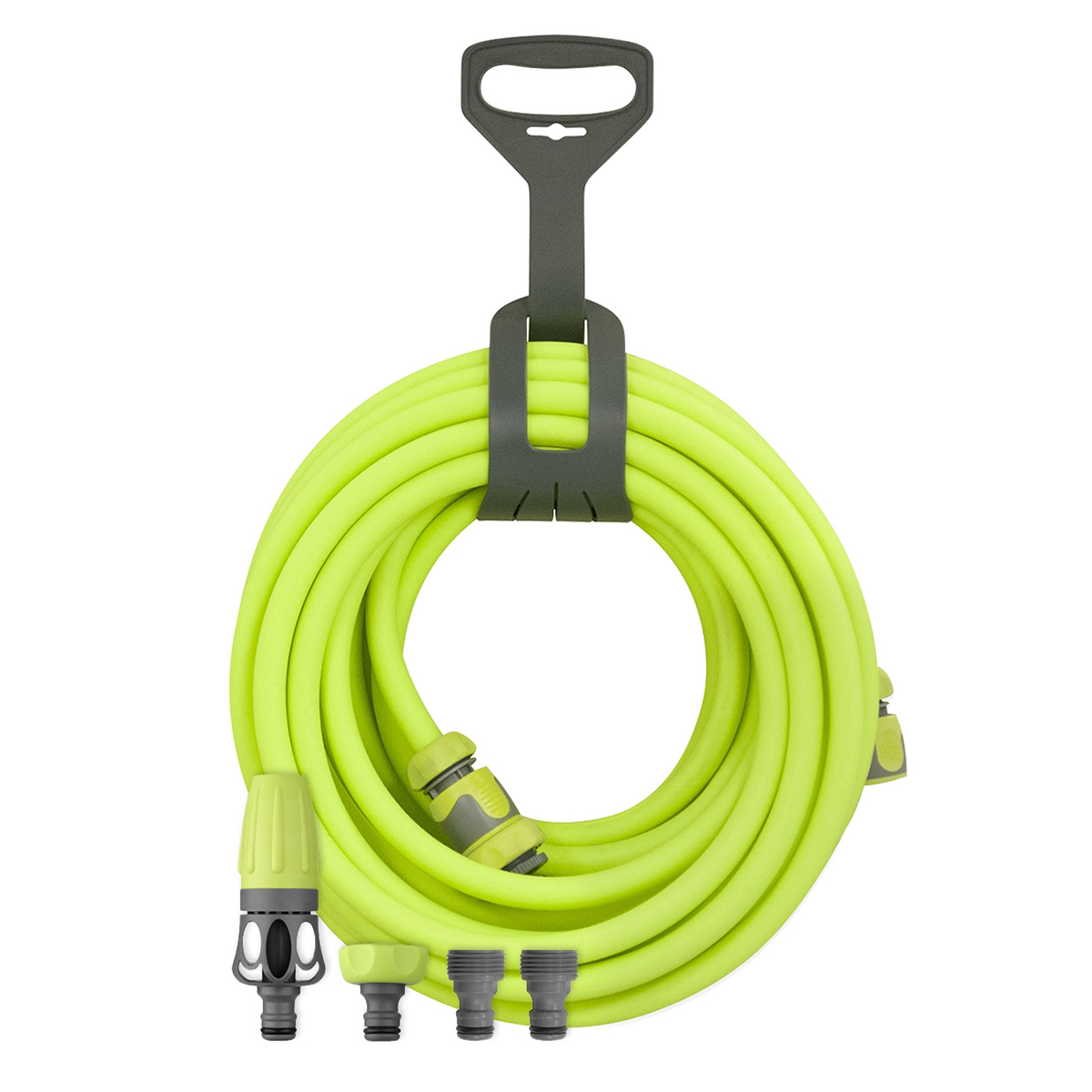 The Flexzilla Garden Hose Kit with Quick Connect Attachments features Flexible Hybrid Polymer material with extreme all-weather flexibility that allows hose to lie flat and won’t kink under pressure