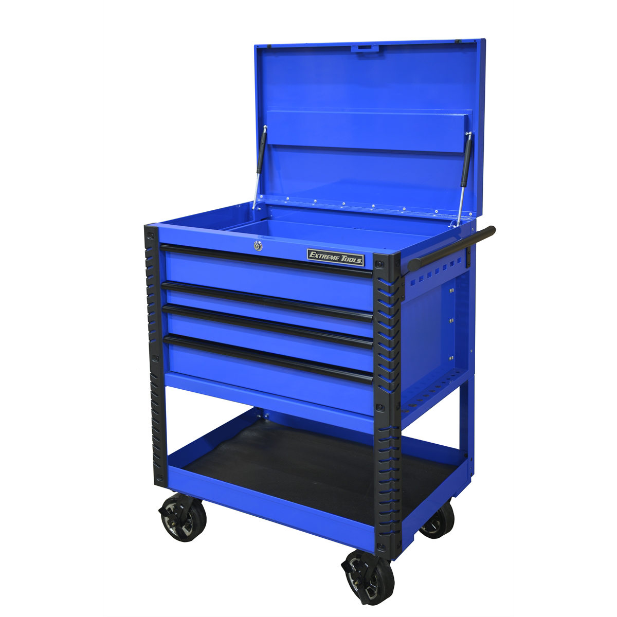 The Extreme Tools® Deluxe Tool Cart (patent-pending) can be used as a stand-alone tool cart, or it can be combined with the Extreme Portable Workstation™. The most unique feature of this tool cart is the top storage compartment. Open the lid and you can access all of the tools in the top drawer. Close the lid to use it as a work surface, and the top drawer pulls open to access your tools. It is the most versatile design you will find! Ball bearing slides on the drawers are load-rated 100 lbs per drawer. Plus, we have included pry bar and tool hangers/holders on the sides of the cart. Open the lid to access your pry bars. Close the lid, and they are securely locked in place to prevent theft. Bumpers on all sides and four lockable swivel casters allow you to easily move the tool cart throughout the workspace.
