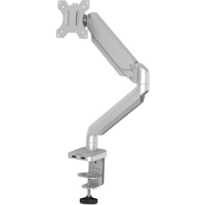 Single-monitor arm in two sections offers versatile positioning and useful features. Adjustable swivel and tilt maximize viewing flexibility. Arm swivels 360 degrees from side to side while the monitor mounting plate swivels 180 degrees. Face of the mounting plate rotates 360 degrees and is 75mm x 75mm and 100mm x 100mm VESA-compatible. You can also tilt your monitor from negative 45 degrees to positive 90 degrees for multiple monitor viewing angles. Monitor arm is height-adjustable to easily improve eye level and posture for optimal comfort. Built-in spring gauge can be adjusted to suit various monitor weights. The 2.0 USB port and audio port in the bottom of the arm are convenient for supporting data transfer, charging and sound input/output. Pear-shaped VESA slot makes monitor installation much easier with a one-step slide-in. Mount through your desk grommet so no need to crawl under your desk to install. Built-in cable management allows an organized and neat work space.